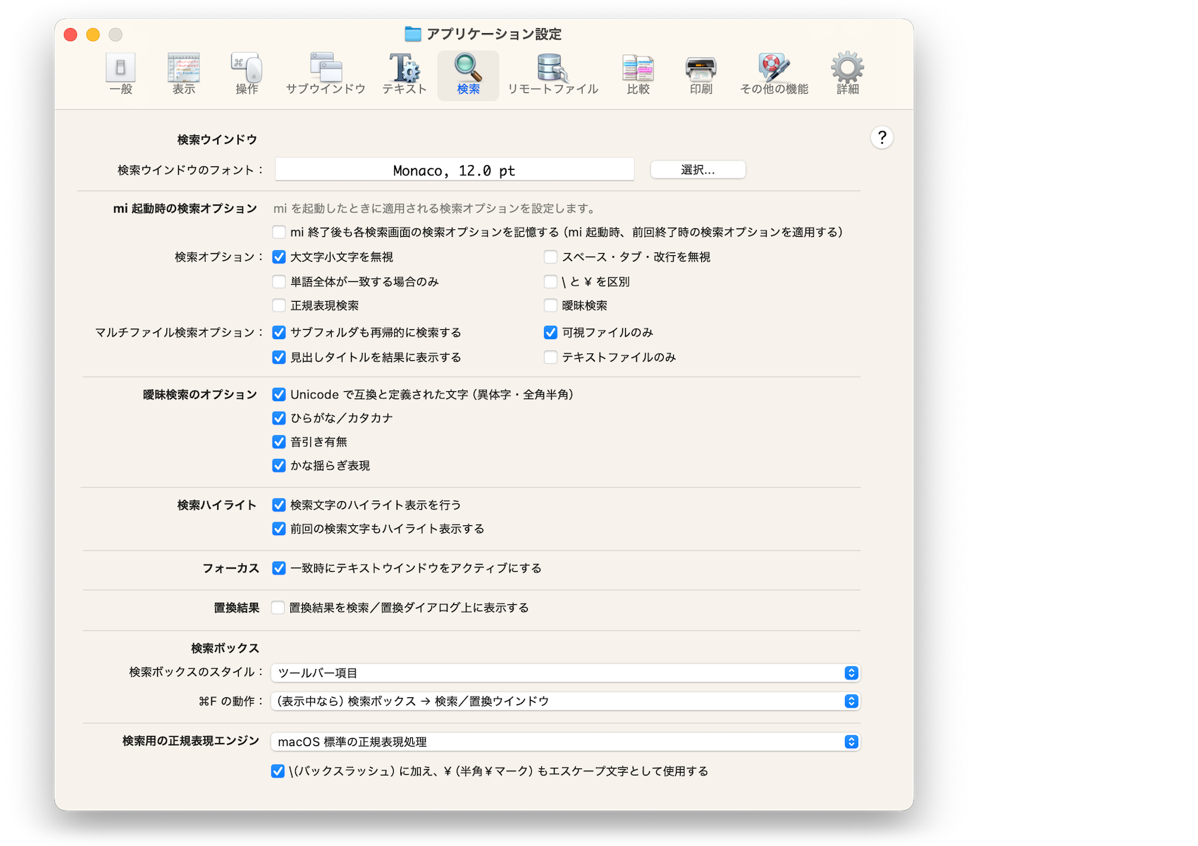 - 検索・置換機能用の正規表現エンジンを「macOS 標準の正規表現処理」「macOS 標準の正規表現処理(単語境界にUnicode TR#29の定義を使う)」「mi バージョン3.7以前互換の正規表現処理」から選択できます。