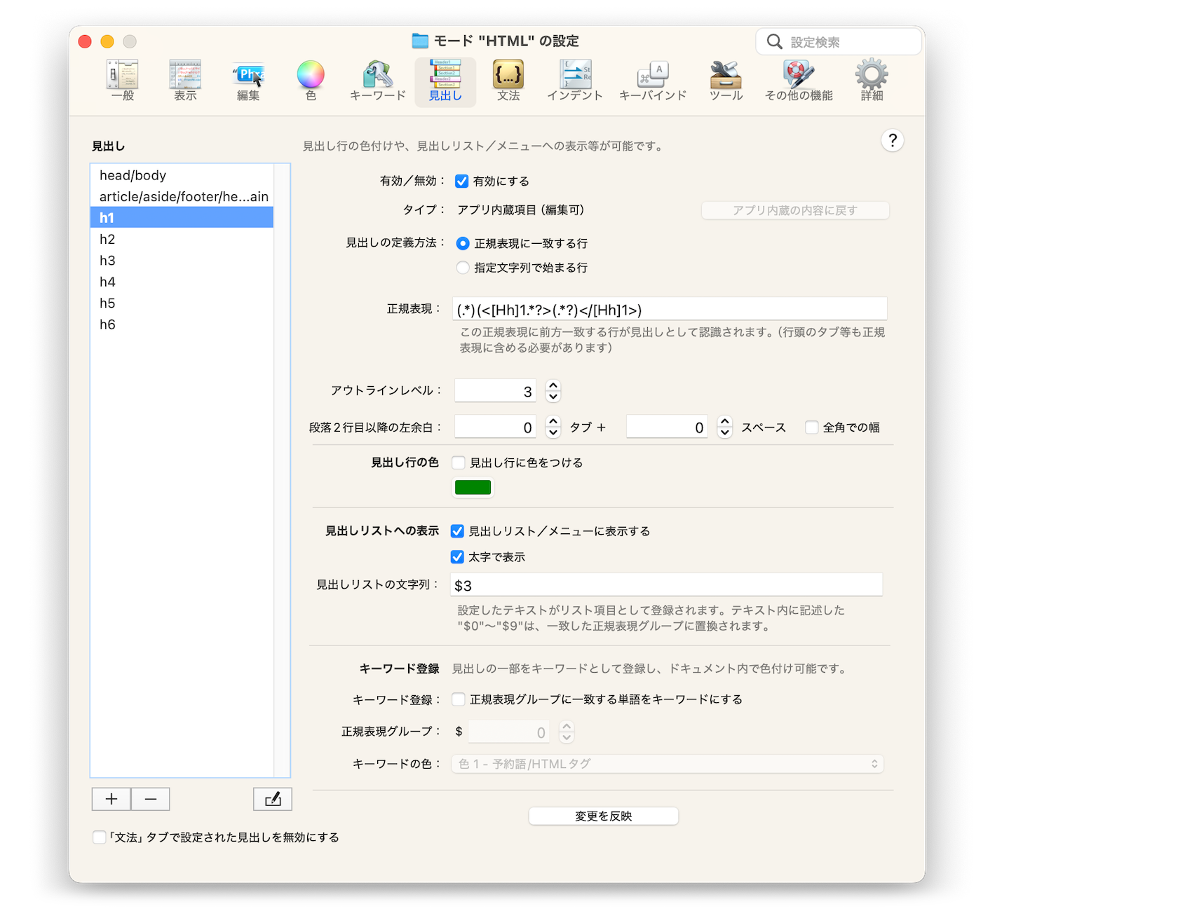 "$0"〜"$9"は一致した正規表現グループ($0:一致した全体、$1〜$9:グループ1〜9)に置換されます。 - モードによっては、HTMLのh1〜h6等、いくつかの見出しが"アプリ内蔵項目"としてすでに設定されています。