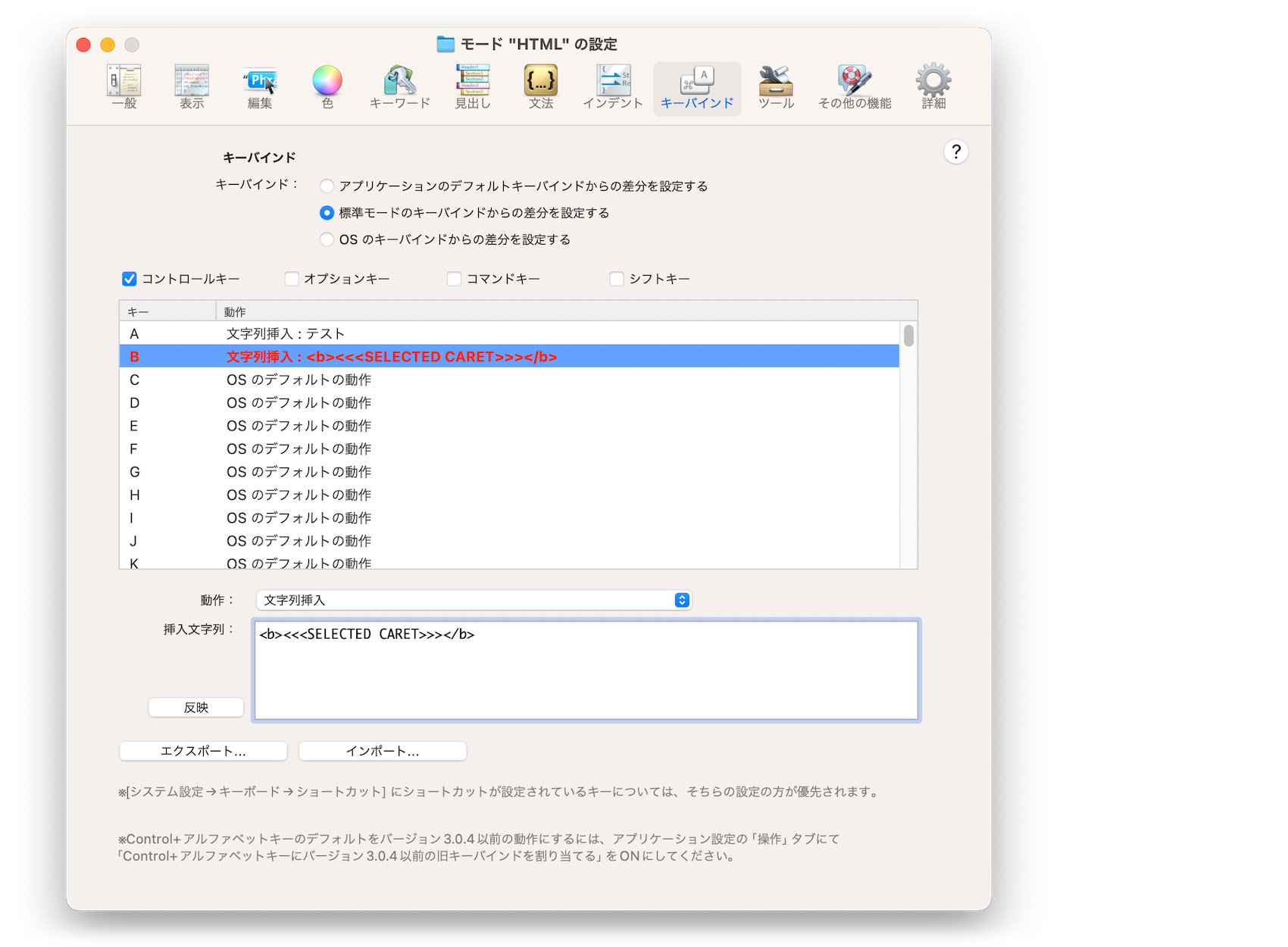 全体で共通のキーバインドは「標準」モードで設定し、モード特有のキーバインドのみ各モードで設定することで、設定の手間を省くことができます。
