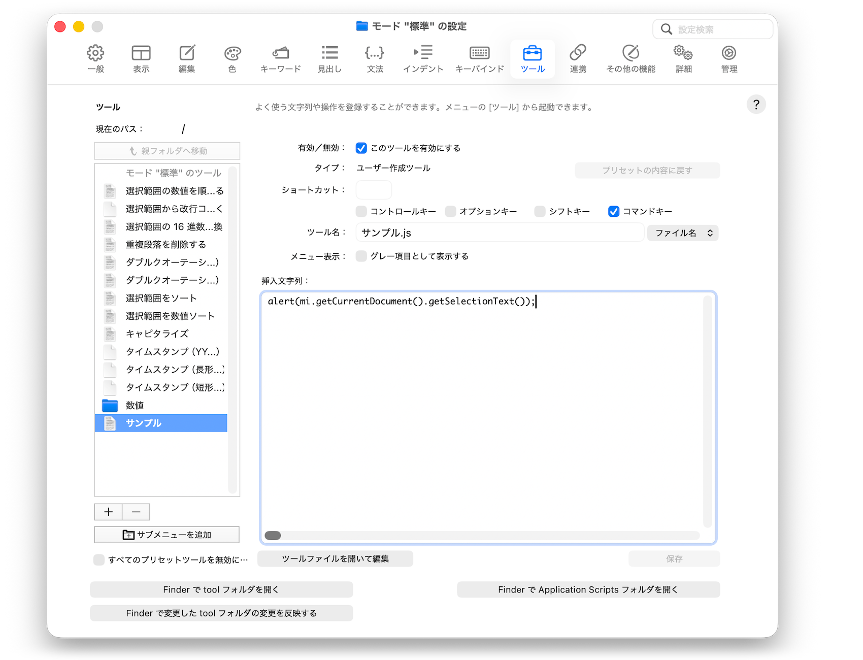 下記の他にも、標準モードのツールのいくつか(「選択範囲の数値を順に+1する」「選択範囲の 16 進数 Unicode を文字に変換」など)はJavaScriptで記述されています。
