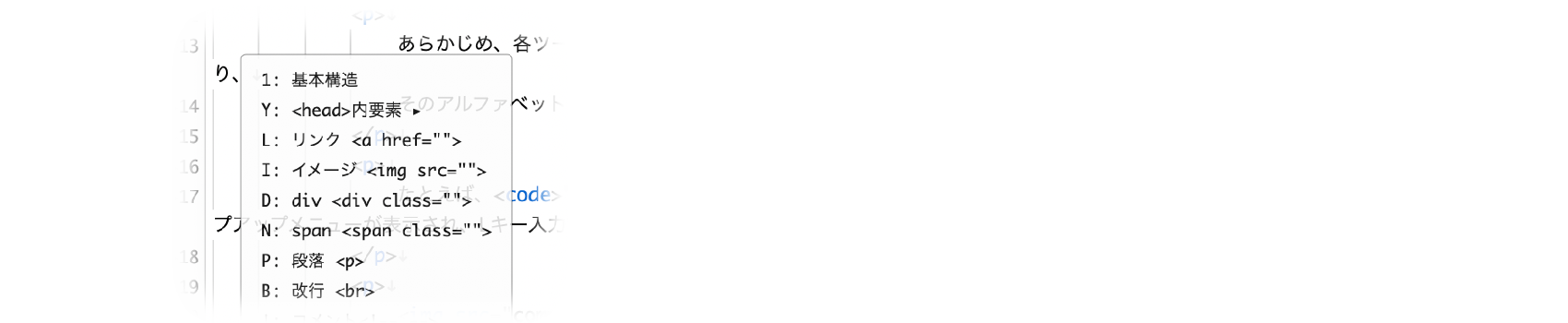 たとえば、HTMLモードの場合、 ⌘ + Y で下のようなポップアップメニューが表示され、Lキー入力で「L リンク」ツールを起動できます。