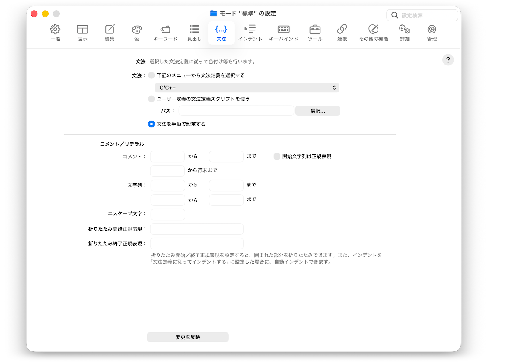 コメント・文字列や、関数名、折りたたみ開始/終了などの文法定義を設定します。