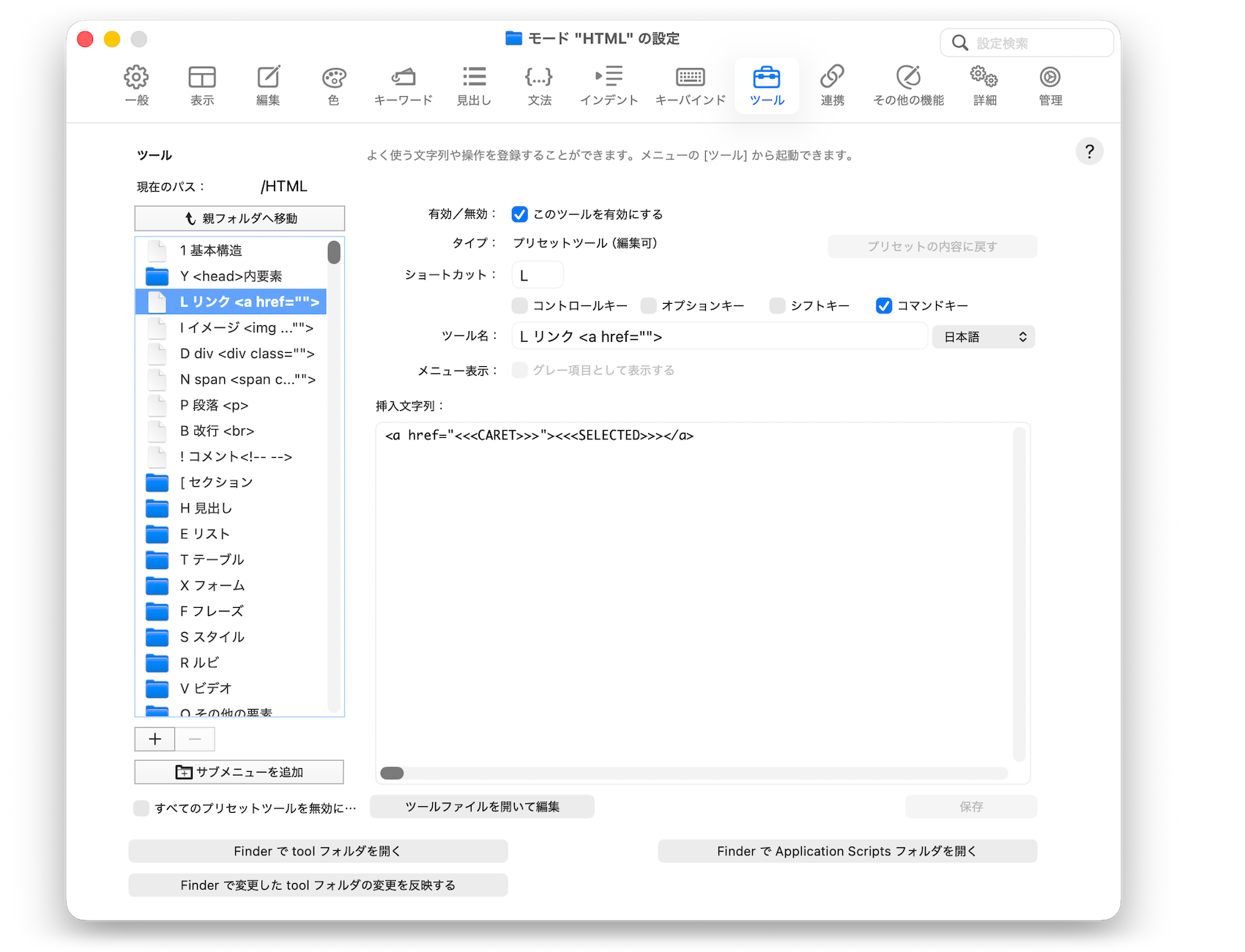 「Finderでtoolフォルダを開く」ボタンでツールフォルダを開き、編集後、「Finderで変更したtoolフォルダの変更を反映する」ボタンをクリックしてください。 - リストにファイルをドラッグ&ドロップすることで、追加することも可能です。