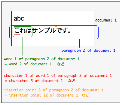 1つの対象を指定するのに、複数の記述方法があります。たとえば上図において、character 1 of word 1 of paragraph 2 of document 1