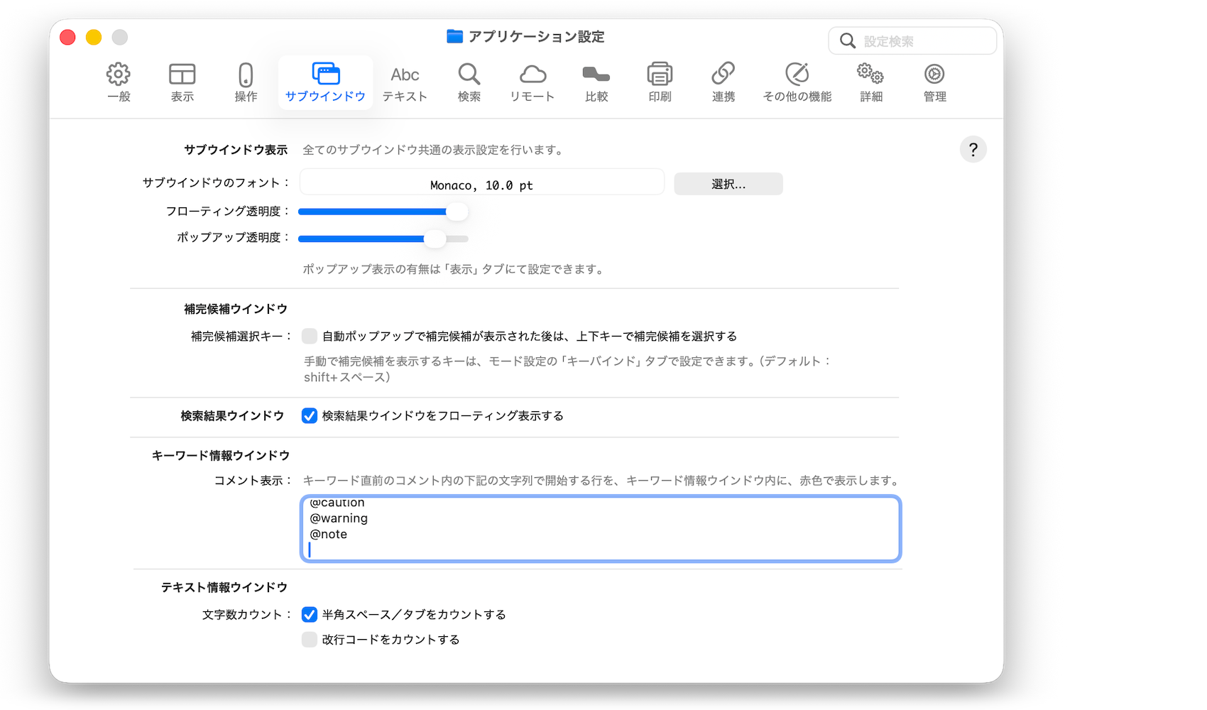 - メニューので開く「テキストカウント」ウインドウの設定とは独立して動作します。