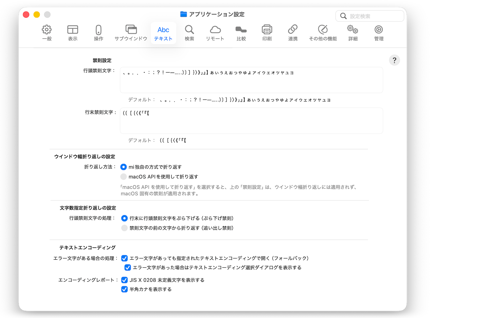 - 「ウインドウ幅折り返しの設定」にて「mi独自の方式で折り返す」をONにしたときのみ、この設定が反映されます。