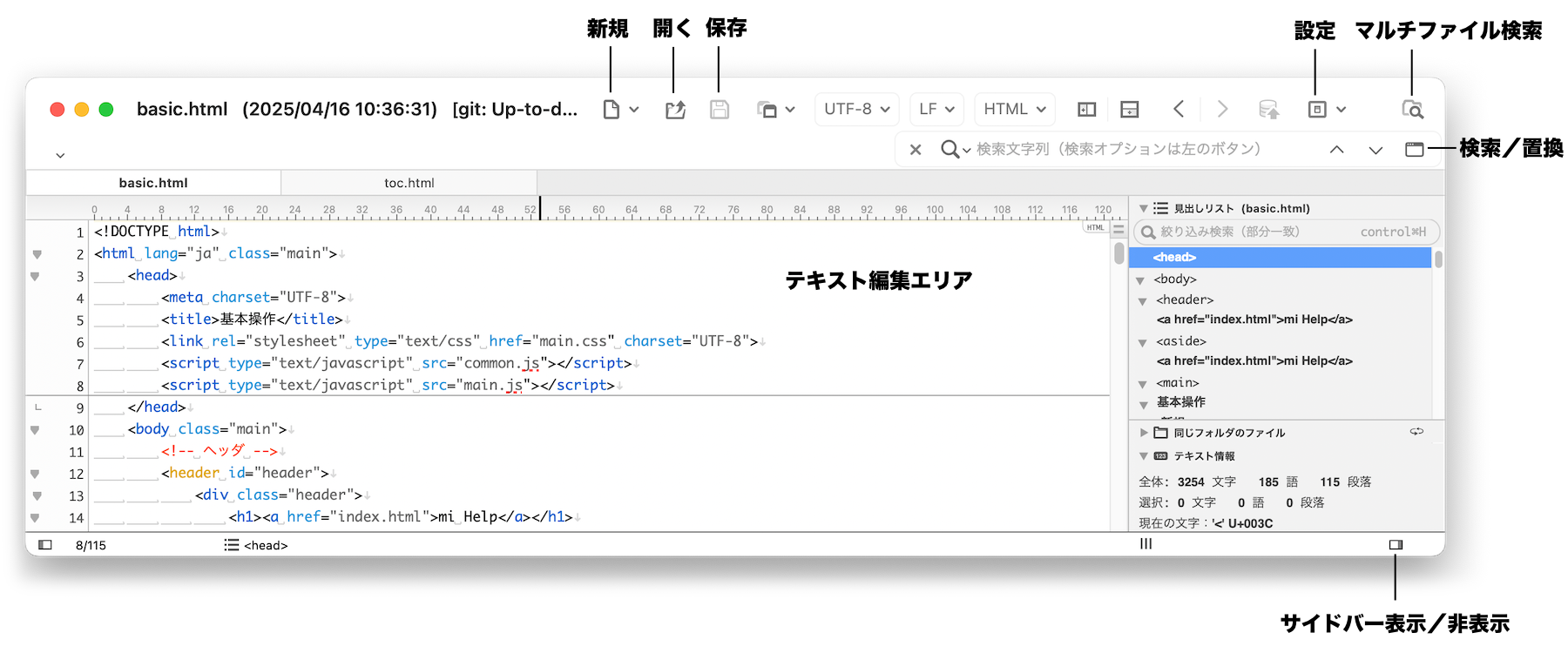 テキスト編集エリアで編集します。