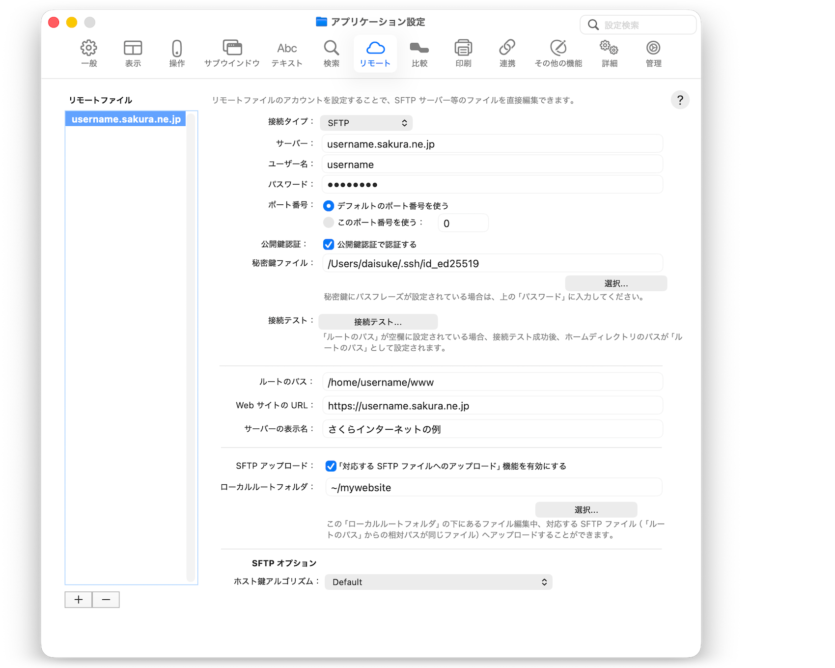 アプリケーション設定→「リモートファイル」タブの「対応する SFTP ファイルへのアップロードを有効にする」をONにすると、「ローカルルートフォルダ」で設定したフォルダの下にあるファイル編集中、以下のいずれかの操作で、対応するSFTPファイル(「ルートのパス」から同じ相対パスのファイル)へアップロードすることができます。
