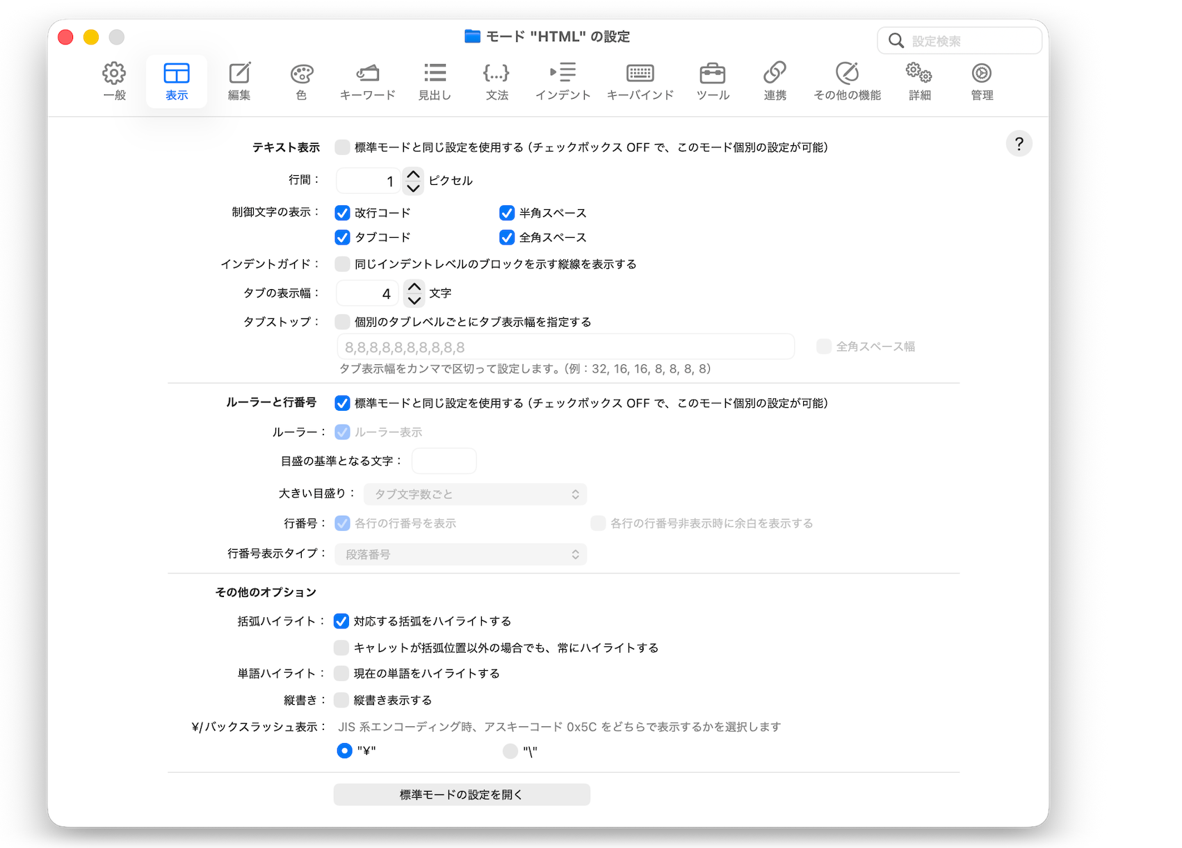 タブ文字を半角スペース何文字分で表示するかを設定します。