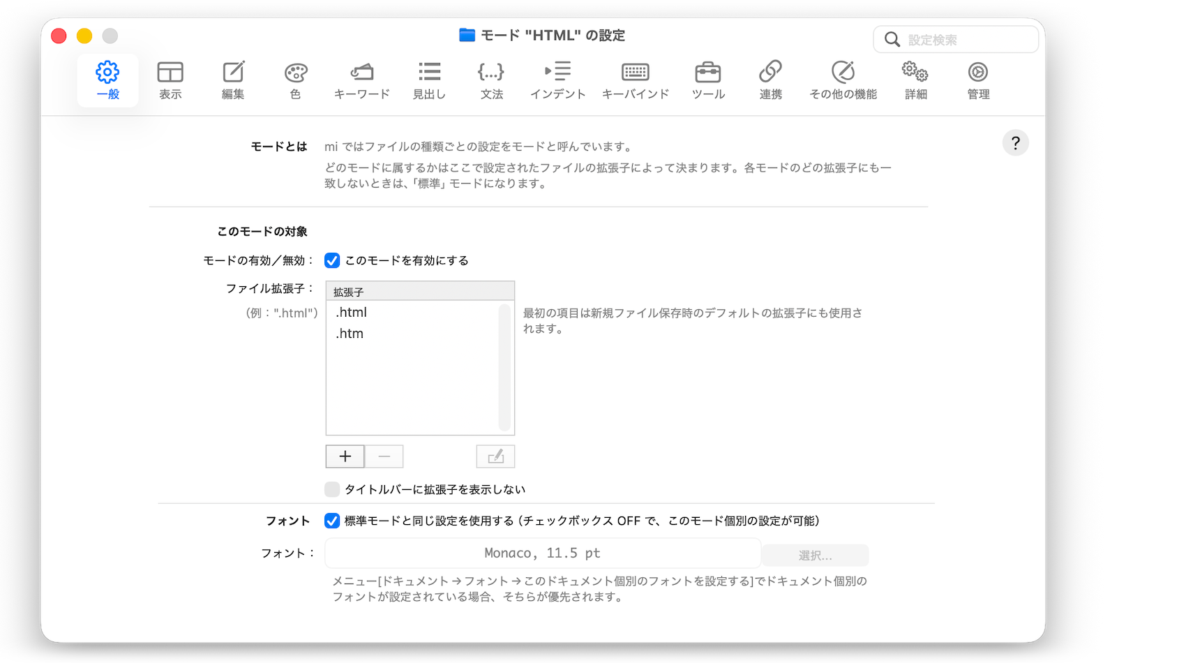 このモードに属するファイルの拡張子をリストで設定します。