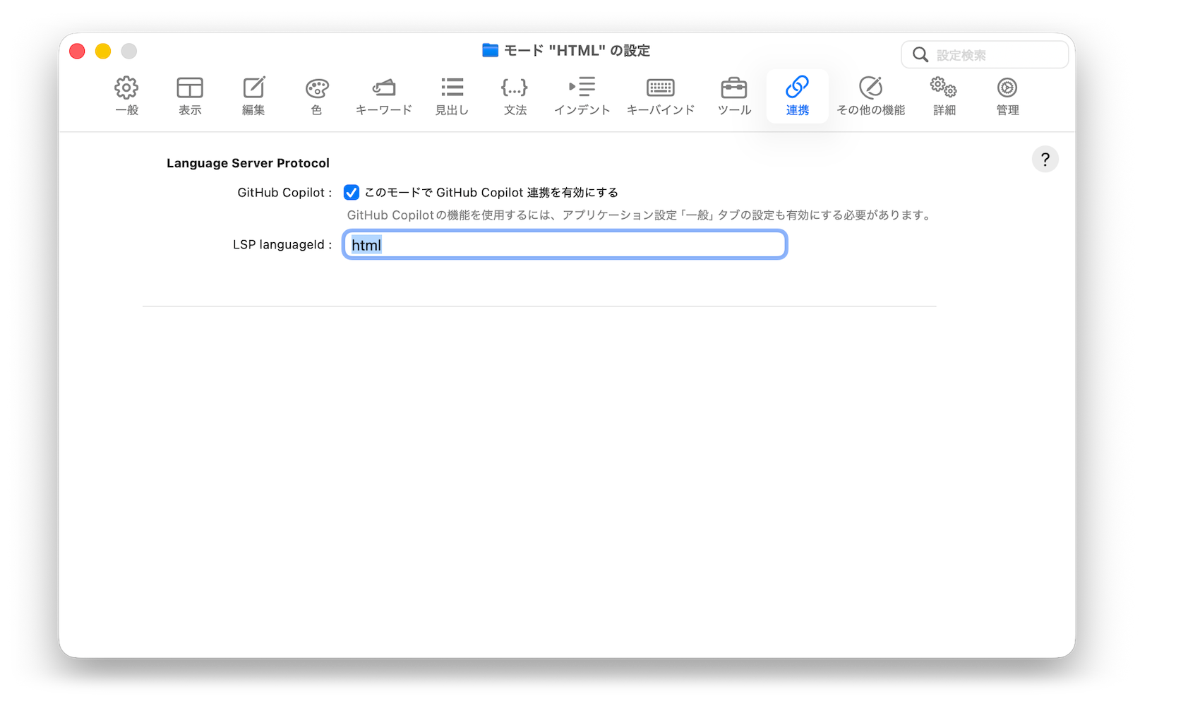 - 「LSP languageId」には、必要な場合、Language Server Protocolの仕様で指定されたlanguageIdを設定してください。