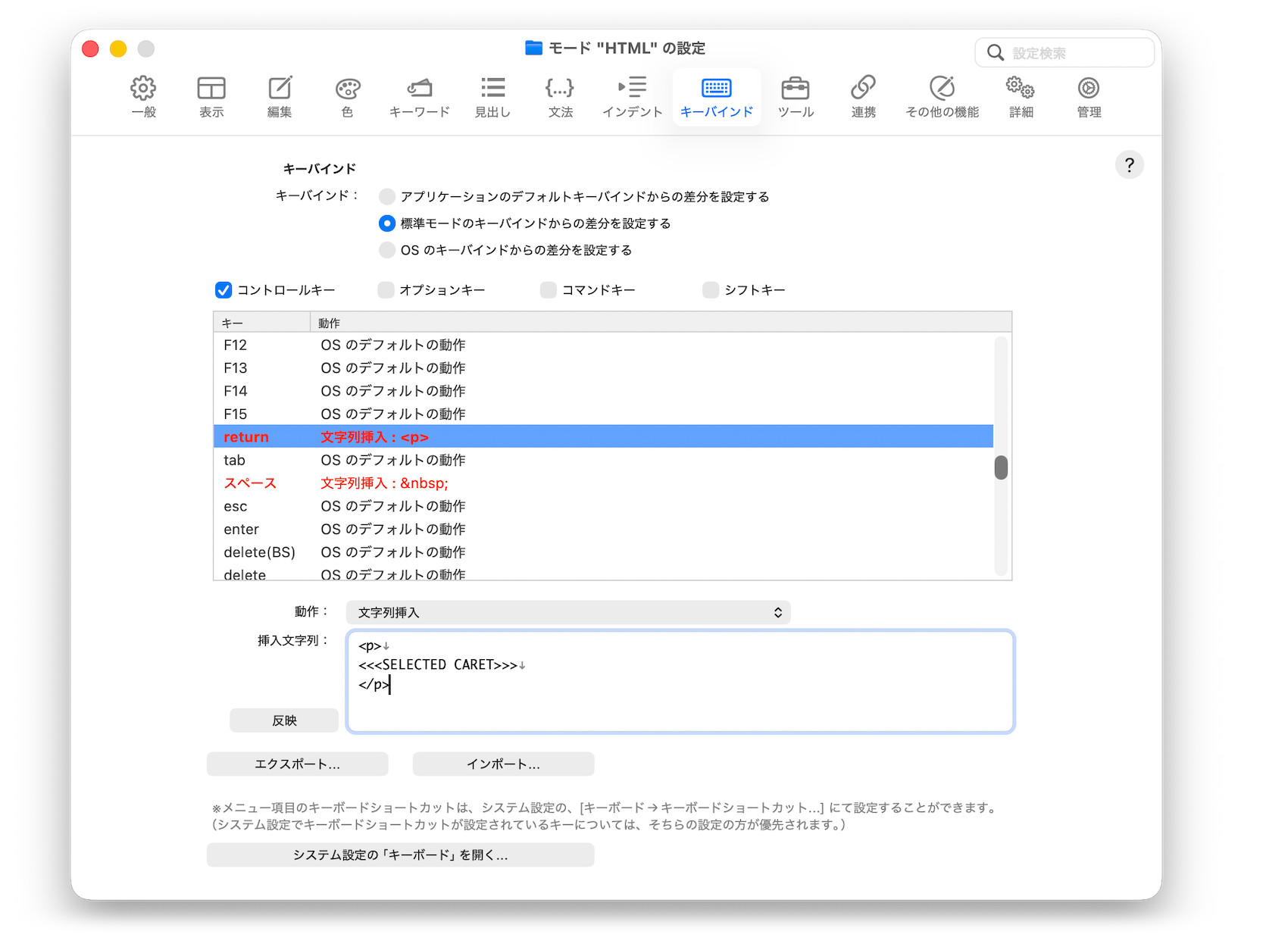 「標準」モードで設定されたキーバインドをベースとします。 全体で共通のキーバインドを「標準」モードで設定し、モード特有のキーバインドのみ各モードで設定することで、設定の手間を省くことができます。 |