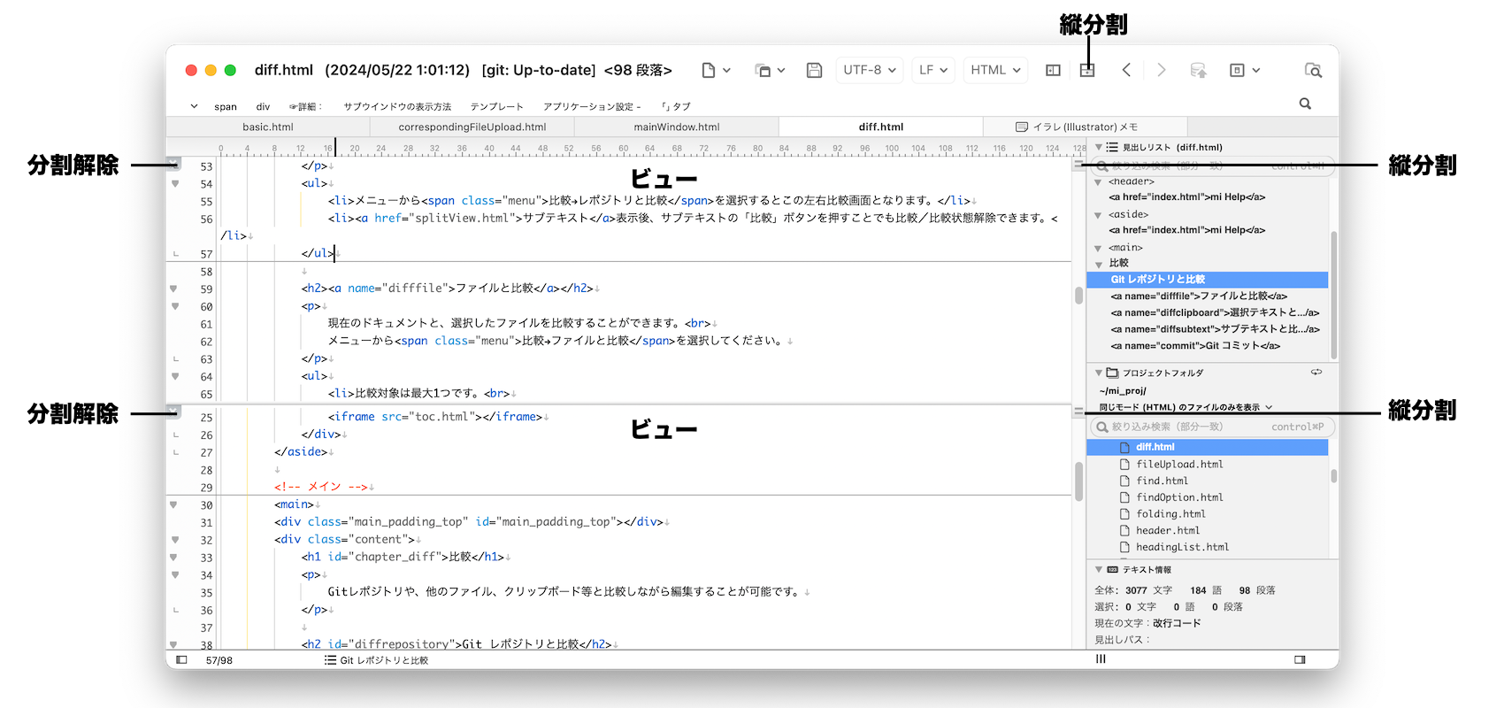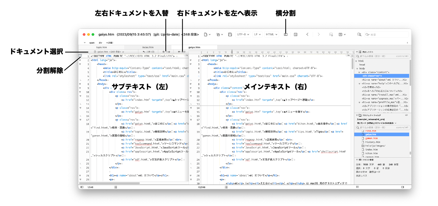 横分割により、メイン(右)のテキストエリアの左側に、サブ(左)のテキストエリアを表示可能です。