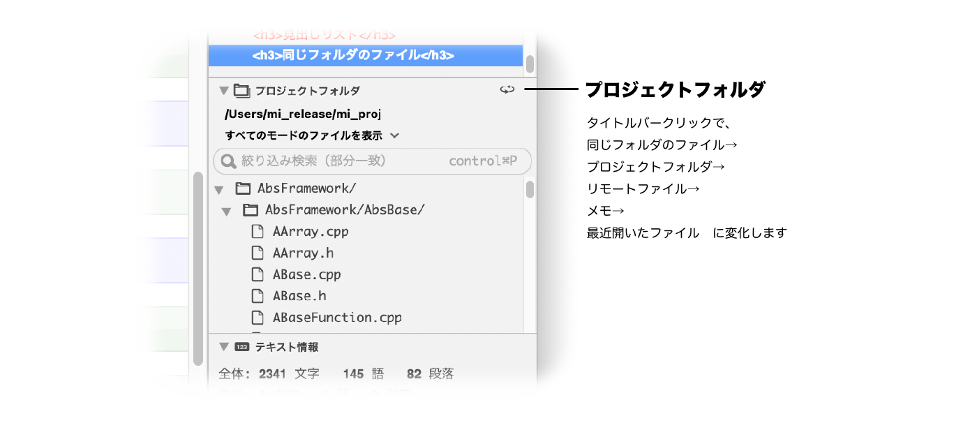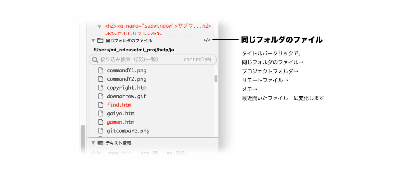 「同じプロジェクトのファイル」サブウインドウから、同じプロジェクトのファイルを開くことができます。 |