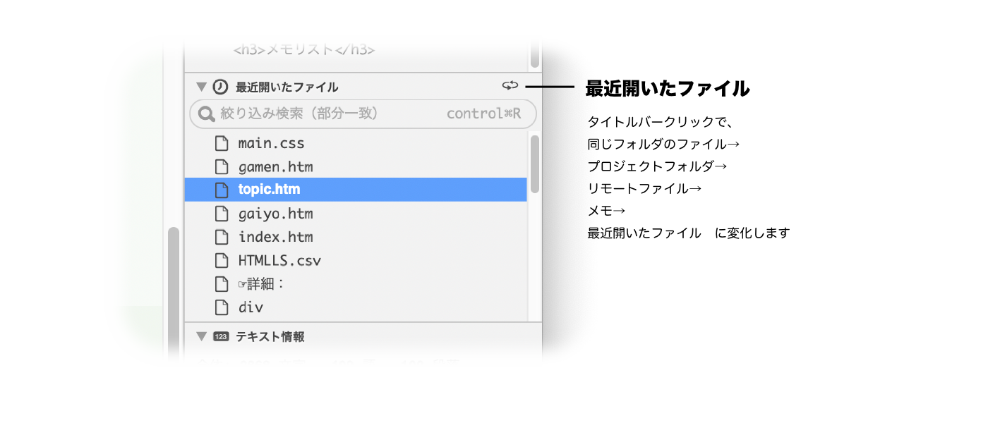 「最近開いたファイル」サブウインドウから、最近開いたファイルを開くことができます。 |