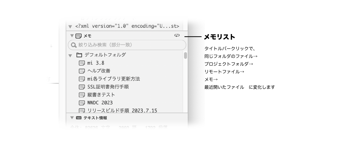 (メモ1項目に対し、1ファイルに保存されます。メモはテキストファイルです。メモリストの項目を右クリックして「Finder上で表示」することができます。) - テキストの1段落目がタイトルとして表示されます。